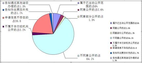 (二)答復(fù)情況。上述231件申請(qǐng)已全部按時(shí)辦結(jié),其中,答復(fù)“屬于已主動(dòng)公開范圍”的14件,占6%;“同意公開”的6件,占2.6%;“同意部分公開”的3件,占1.3%;“不同意公開”的148件,占64.1%;“不屬于本行政機(jī)關(guān)公開”的5件,占2.2%;“申請(qǐng)信息不存在”的48件,占20.8%;“告知作出更改補(bǔ)充”的4件,占1.7%;“告知通過其他途徑辦理”的3件,占1.3%。參見下圖:
