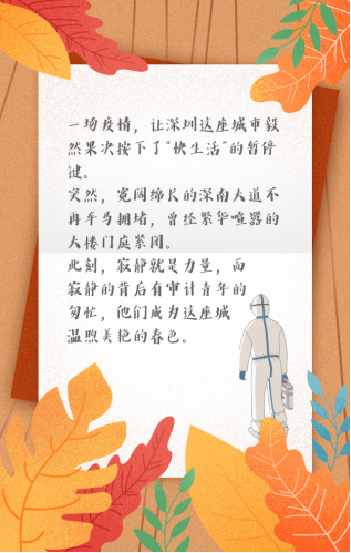 審計(jì)志愿者們沒有停下忙碌的腳步,他們或已參加防疫專班、或在管控區(qū)服務(wù)、或在組隊(duì)守護(hù)家園。劉婉卿把幼兒交給公婆,擔(dān)任臨時(shí)核酸檢測服務(wù)隊(duì)的綁管員,頂著烈日、堅(jiān)守崗位。她說,“掃碼排隊(duì),十人一組,這逐漸變成了深圳人的習(xí)以為常。暗夜終有破曉時(shí),我愿與每一個(gè)默默付出的身影一道”。