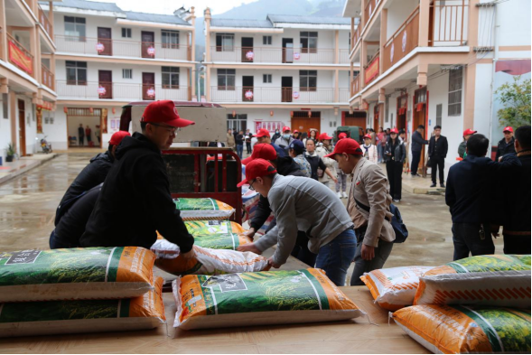 圖為“雙百雙新”項目審計組青年干部在向當(dāng)?shù)卮迕窬栀涋r(nóng)用物資
